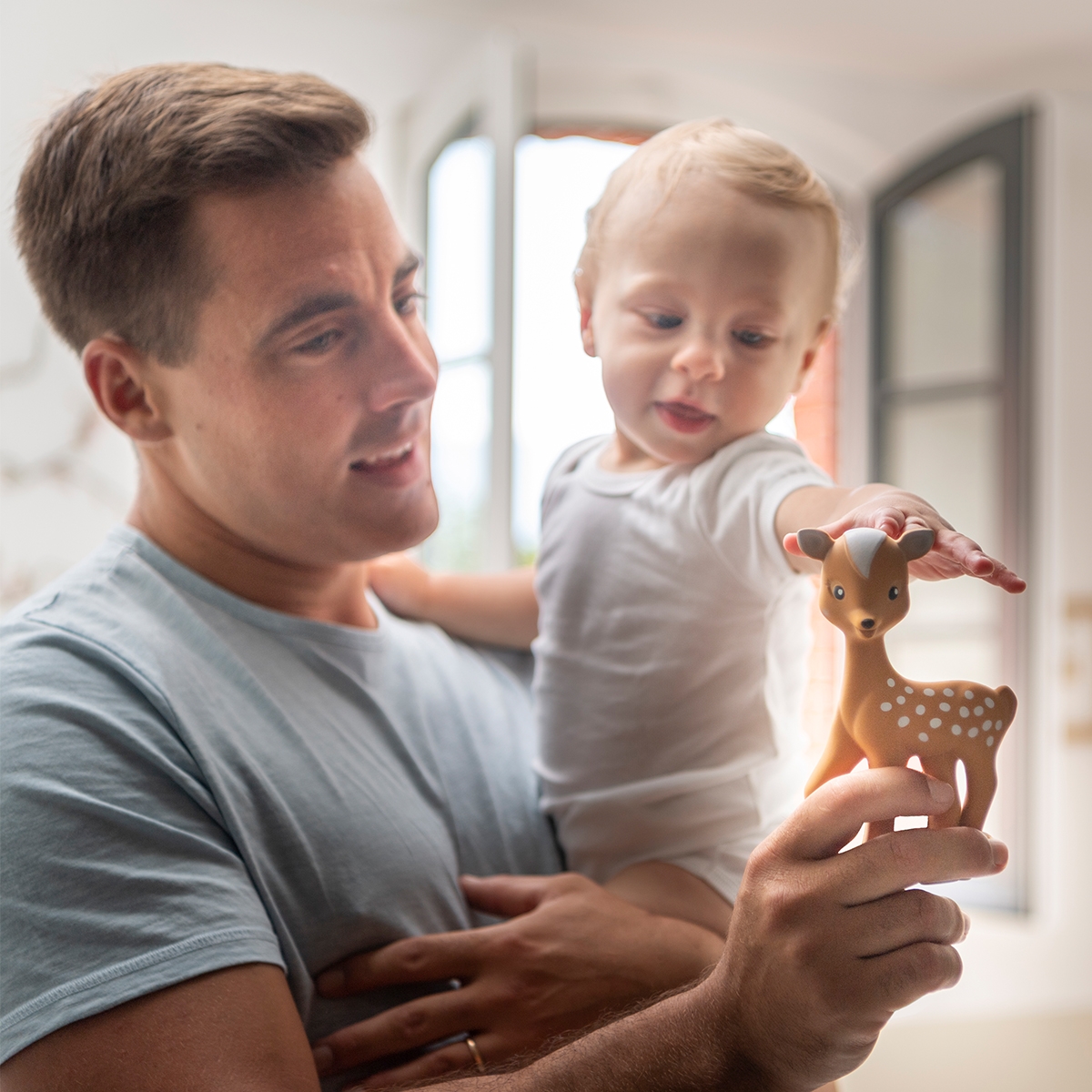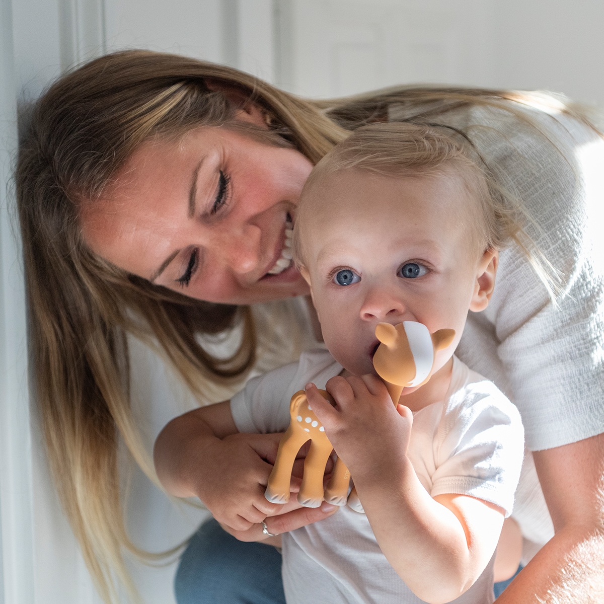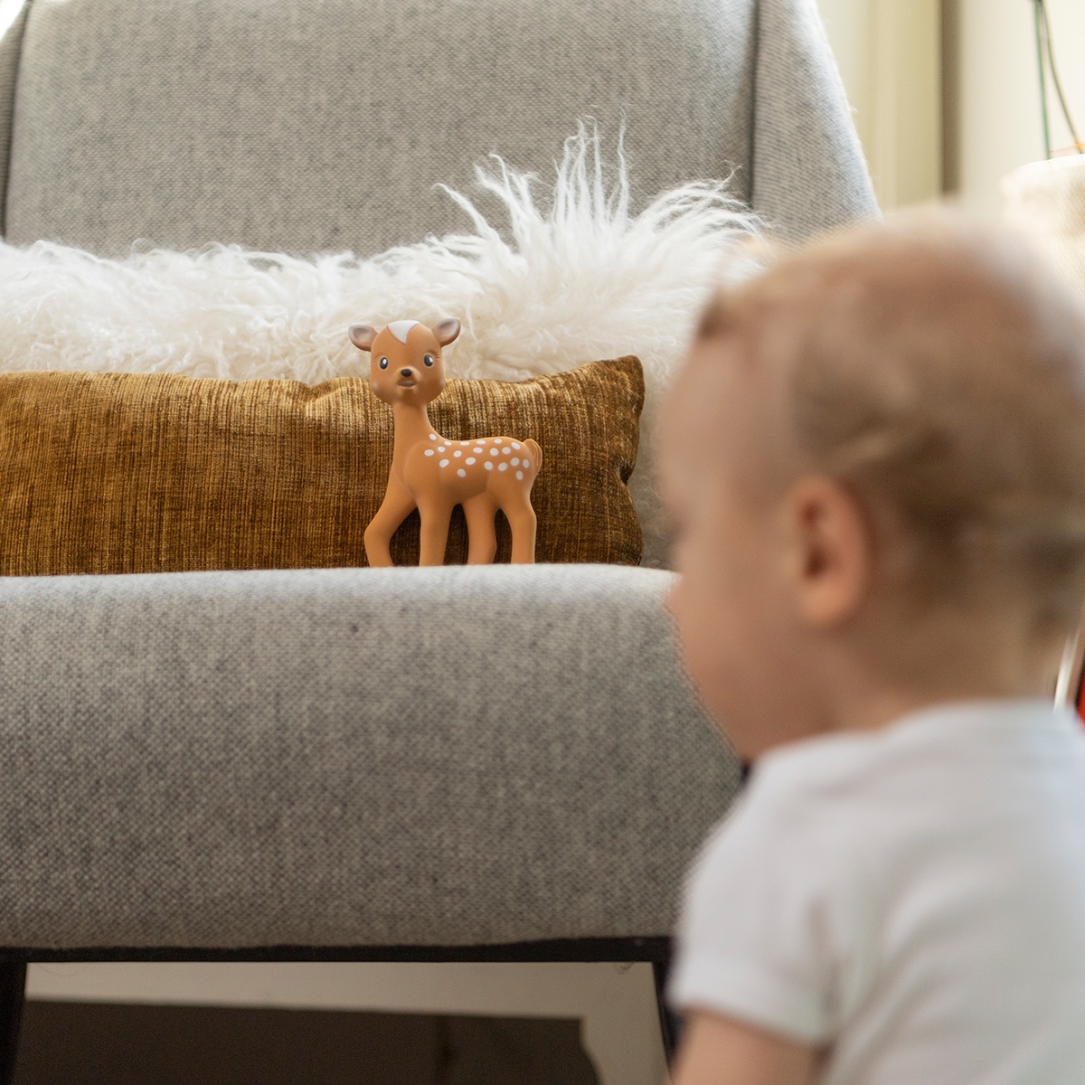 FanFan le Faon är en underbar bitleksak som stimulerar bebisens sinnen redan från 3 månaders ålder. Den är lätt för små händer att greppa och perfekt för att lugna ömt tandkött när tänderna börjar komma fram. De kontrasterande färgerna och prickarna på FanFans kropp stimulerar bebisens syn, och när du trycker på FanFan hörs ett sött pipljud som fångar barnets uppmärksamhet.