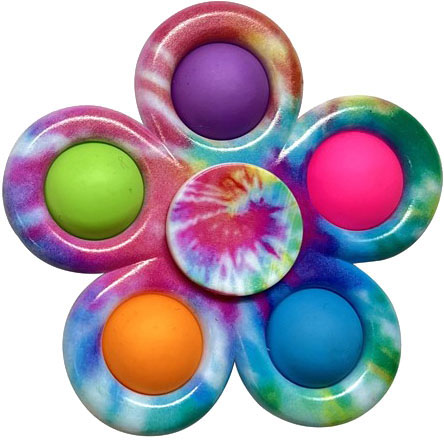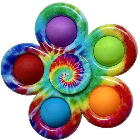Pop It Tie-Dye FidgetSspinner är en leksak som kombinerar två populära element – ”pop it” och fidget spinner – med en färgstark och virvlande design. ”Pop it” är en taktil leksak med tryckbara bubblor som ger en tillfredsställande känsla och ljud när de pressas ned. En fidget spinner är en liten leksak som snurrar runt en axel och används för att lindra stress och nervositet genom att snurra den mellan fingrarna. Den ”Pop it tie-dye fidget spinner” erbjuder användare en dubbel lekupplevelse. Å ena sidan kan de trycka på bubblorna och få en taktil känsla och ljud, och å andra sidan kan de snurra den färgstarka leksaken för att minska stress och nervositet.