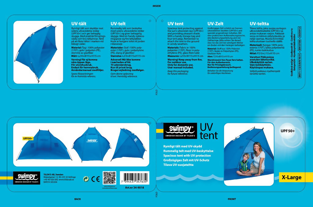 YSwimpy Large är ett rymligt och robust solskyddstält (UV-tält) för soliga dagar på stranden och i trädgården. Soltältet skyddar mot solens ultravioletta strålar (UV-skydd 50+ ) och ger fin skugga. När UV-tältet inte används packas det i medföljande transport- och förvaringsväska. Monteringsöglor och tältpinnar (ingår) för blåsiga dagar. Soltältet väger endast 1 kg och blir litet packat (52 x 10 cm), vilket gör det enkelt att ta med till stranden och med på semesterresor.