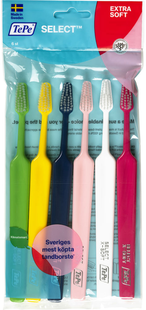 TePe Select är en hållbar, prisvärd och användarvänlig tandborste. Utvecklad i samråd med tandvårdsexpertis för skonsam och effektiv plackborttagning. Tandborsten finns i tre storlekar och mjukheter på stråna: extra soft, soft, and medium. Ett avsmalnande borsthuvud för god åtkomlighet och topprundade strån för skonsam rengöring. Skaftet kan vinklas efter uppvärmning i varmt vatten. Borsta tänderna två gånger per dag, morgon och kväll, med fluortandkräm för att upprätthålla en god munhälsa. Kan användas av vuxna och ungdomar.
