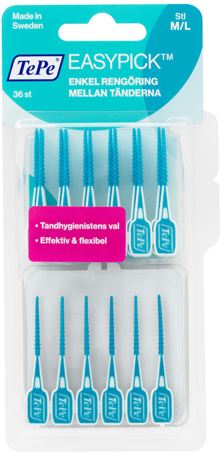 TePe EasyPick är ett enkelt och effektivt sätt att göra rent mellan tänderna, för en frisk mun och rena tänder. En unik kombination av material gör tandpetaren hållbar, flexibel och bekväm att använda. Unika silikonlameller ökar kontaktytan mot tänderna för effektiv rengöring. Skaft med non-slip grepp och lång arbetslängd ger en säker och skonsam rengöring. Även vid tandställning, implantat och kronor. Daglig användning av TePe EasyPick skapar en hälsosam rutin – rekommenderas av tandvården. Regelbunden användning motverkar plack och inflammerat tandkött. EasyPick finns i tre överlappande storlekar: XS/S för smala mellanrum, M/L för mellan till större mellanrum och XL för stora mellanrum.