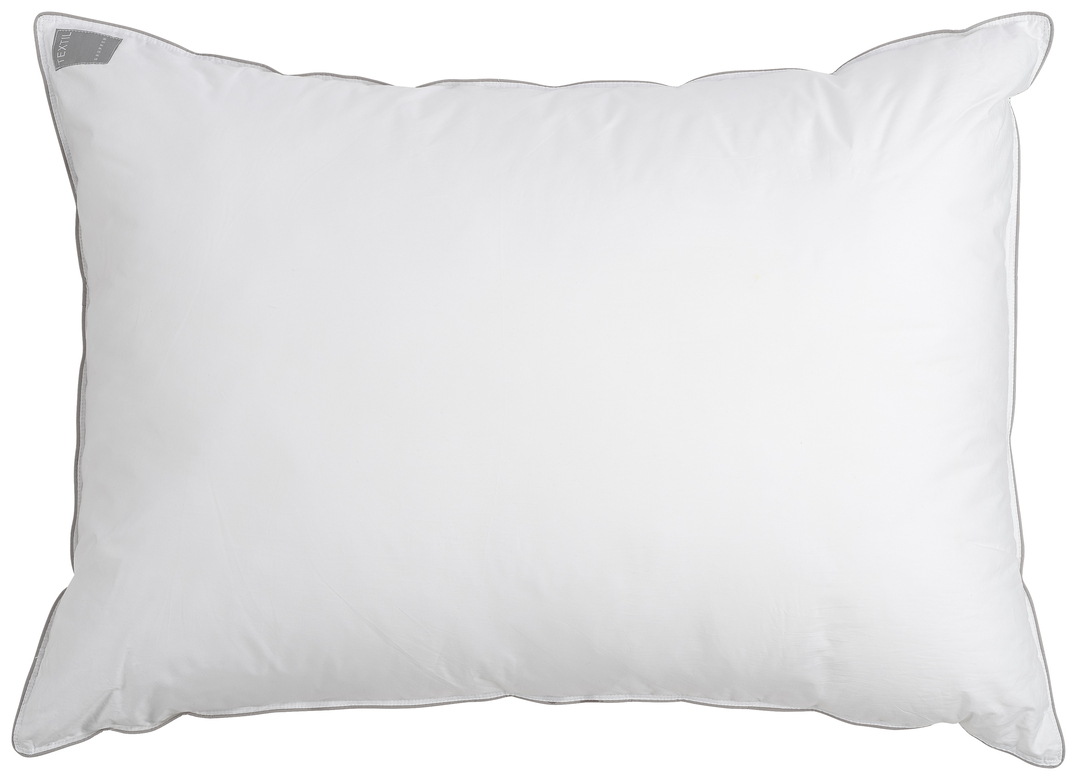 Textilgruppen kudde i slitstark bomullscambric med grå passpoal runt om och en fyllning av 1150 gram hålfiber. Kudden är extra stor och ger bäddningen den rätta hotellkänslan.