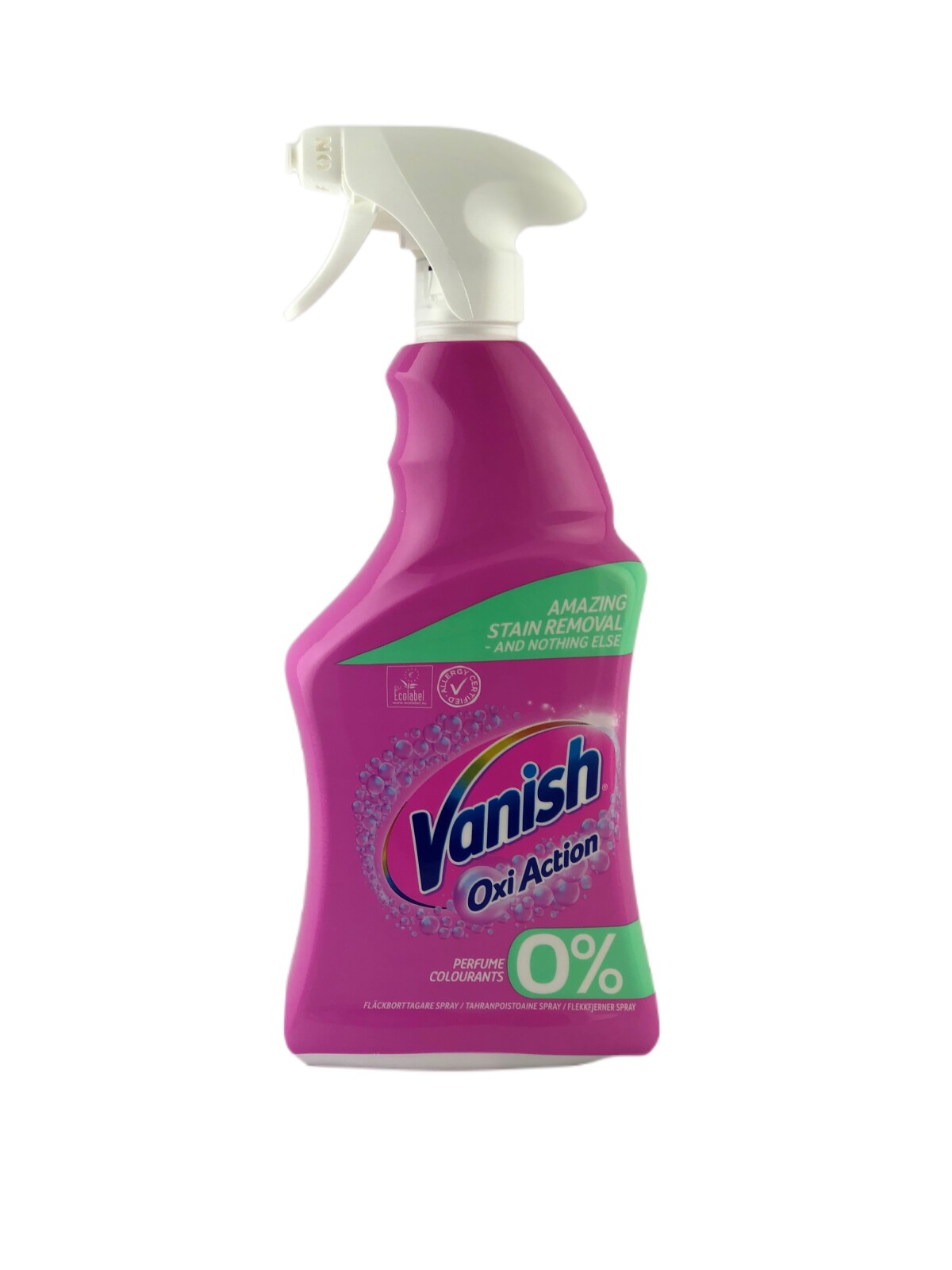 Vanish 0% förbehandlingsmedel släpper syre, vilket hjälper till att ta bort fläckar. Dess ytaktiva ämnen mjukar upp torkad smuts, vilket gör det lättare att ta bort fettfläckar.