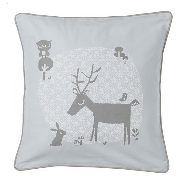 Tvåsidigt kuddfodral i 100% Oeko-tex certifierad bomull som ger barnrummet lite extra piff. Den ena sidan med Forest Friends och den andra med Grey Leaf.